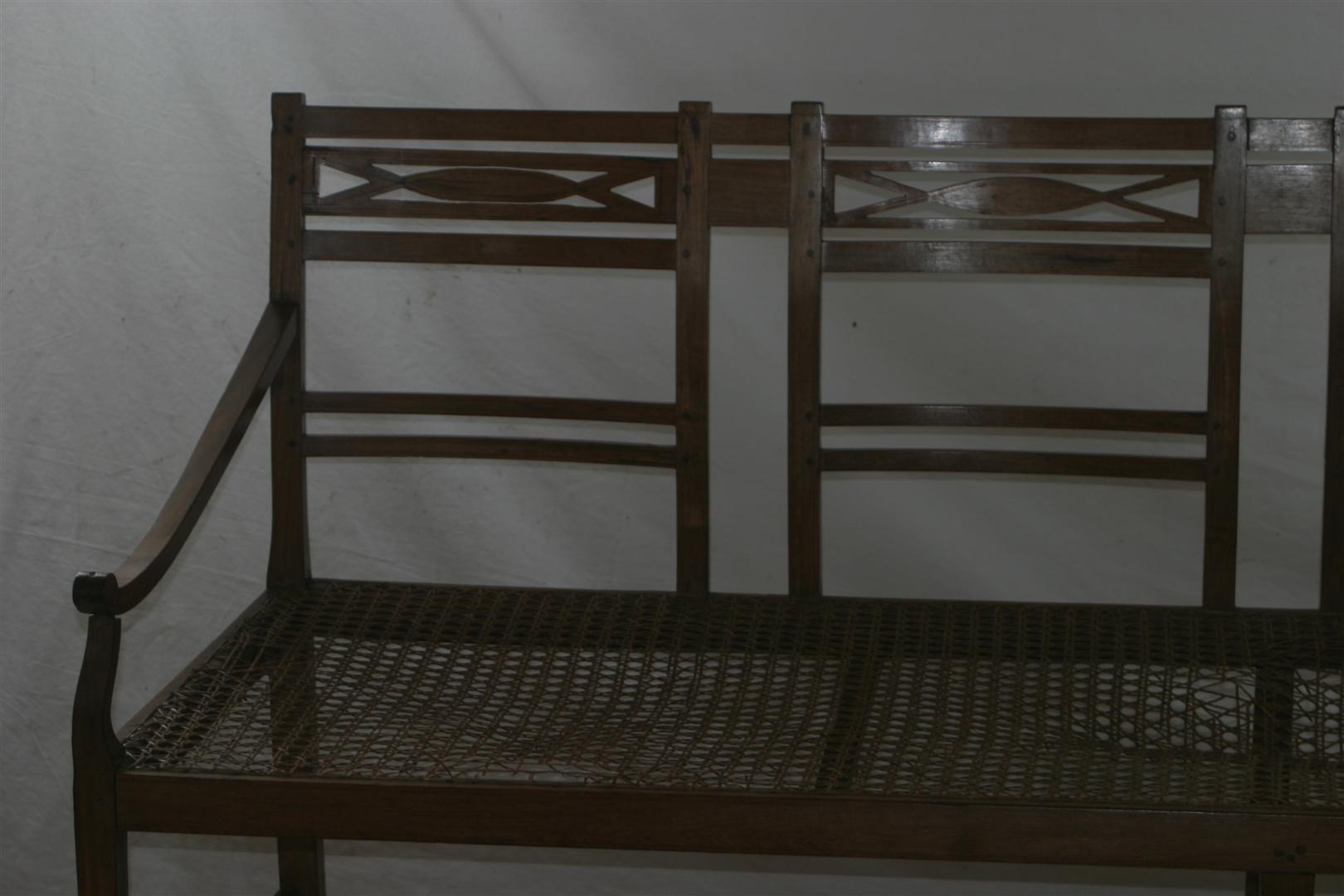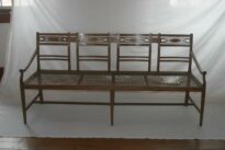 Canapé confeccionado em madeira (jacarandá), de linhas retilíneas, em estilo D. Maria I, ornado por filetes em madeira mais clara (pau-marfim), na técnica da marchetaria. Peça disposta para quatro lugares, tendo encosto composto por quatro espaldares. Cada espaldar é estruturado através de duas hastes horizontais, dispostas na parte central, ornadas por dupla de filetes, e, na parte superior, apresenta estrutura retangular vazada, ornada por motivos geometrizados, contornados por filetes, intercalando outras duas hastes horizontais. Os quatro espaldares encontram-se interligados através de seis estruturas de madeira, sendo as três superiores mais espessas e em formato retangular, e as três inferiores de formato quadrangular, fixadas por pregos. Apresenta braços laterais dispostos em leve curvatura e arrematados por volutas (uma de cada lado). Assento inteiriço, de formato trapezoidal, composto por palhinha trançada. Peça apoiada sobre seis pernas, de secção quadrangular. As três pernas dianteiras se afinam para baixo e as três posteriores, mais espessas, são ligeiramente abauladas e voltadas para trás. Apresenta dois travejamentos em “H”. As duas pernas dianteiras das extremidades são arrematadas, na parte superior, por estruturas longilíneas em curva, onde se encaixam os braços. Parte frontal do móvel com ornamentação em filetes de madeira mais clara. Assento sustentado, na parte inferior, por duas hastes chapadas de madeira (para reforço).