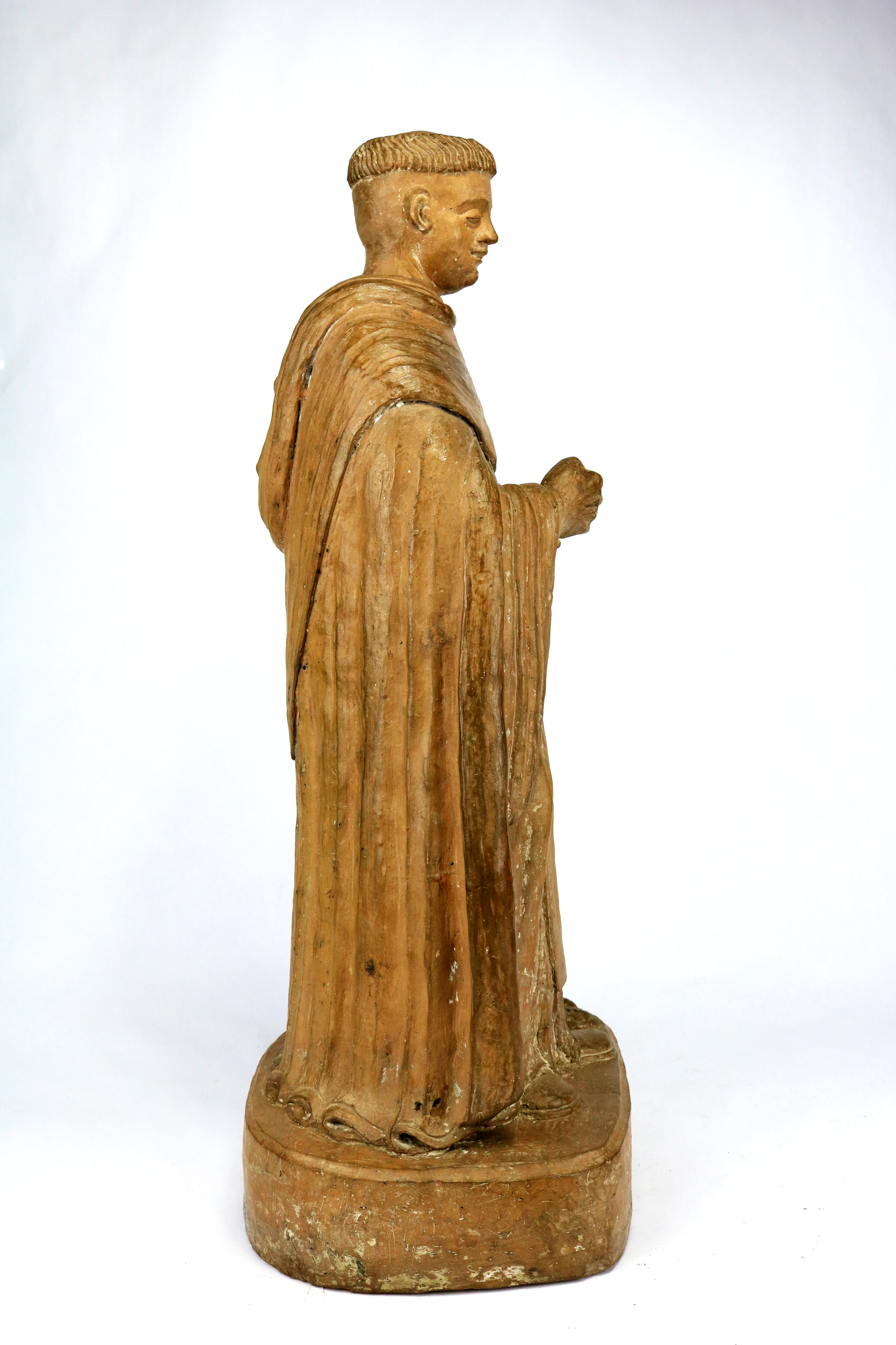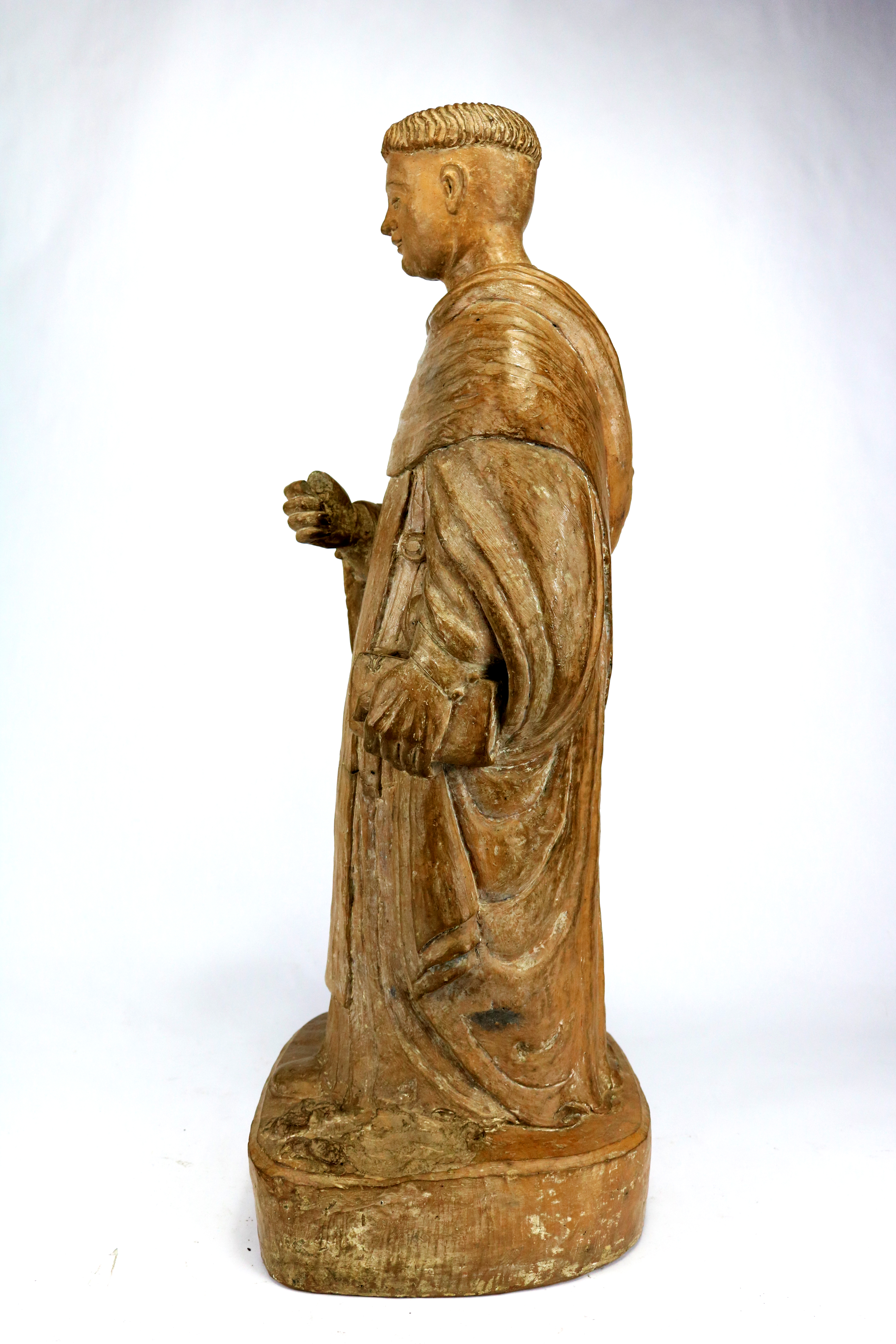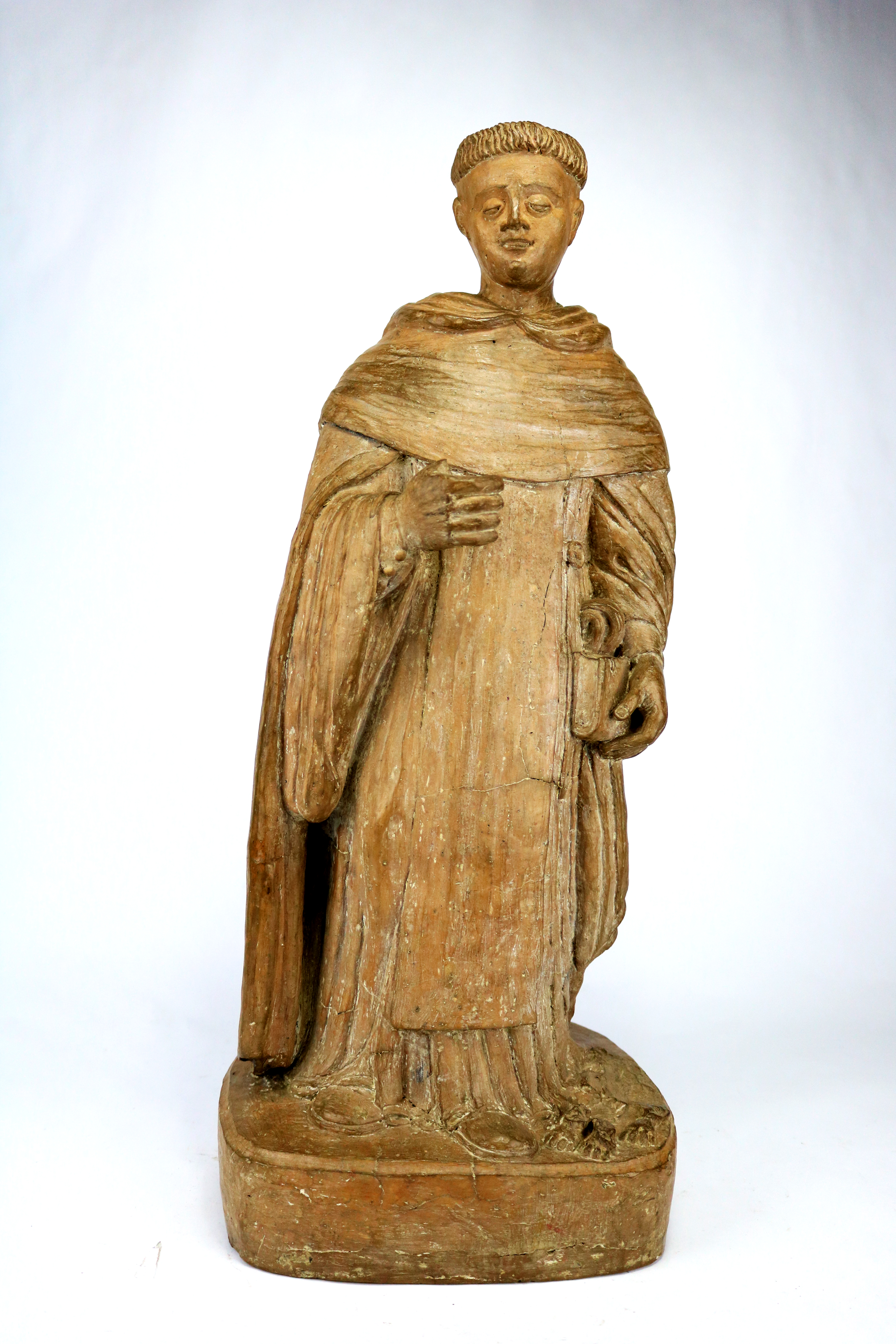 Figura masculina, jovem, imberbe, de pé, em posição frontal, com a cabeça erguida, olhos direcionados para baixo; com ampla tonsura, rodeada por mechas sinuosas de cabelo; boca entreaberta; orelhas pouco destacadas do crânio. Tem o braço direito flexionado à frente, mão de segurar; braço esquerdo estendido lateralmente, mão sustentando um livro fechado; perna direita levemente flexionada, e a esquerda reta, com os pés em ângulo suave, calçados em sapatos arredondados. Vestido em hábito cingido por cinto de fivela com ponta caída; mangas com cogulas e abaixo delas punhos com botões (três na direita e dois na esquerda); escapulário comprido e largo; murça e capuz caído por trás. Base de forma retangular, arredondada nas quinas, com a borda superior chanfrada; possuí sobre a superfície direita os restos de três patas do cachorro que acompanha o santo.