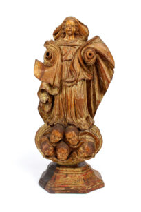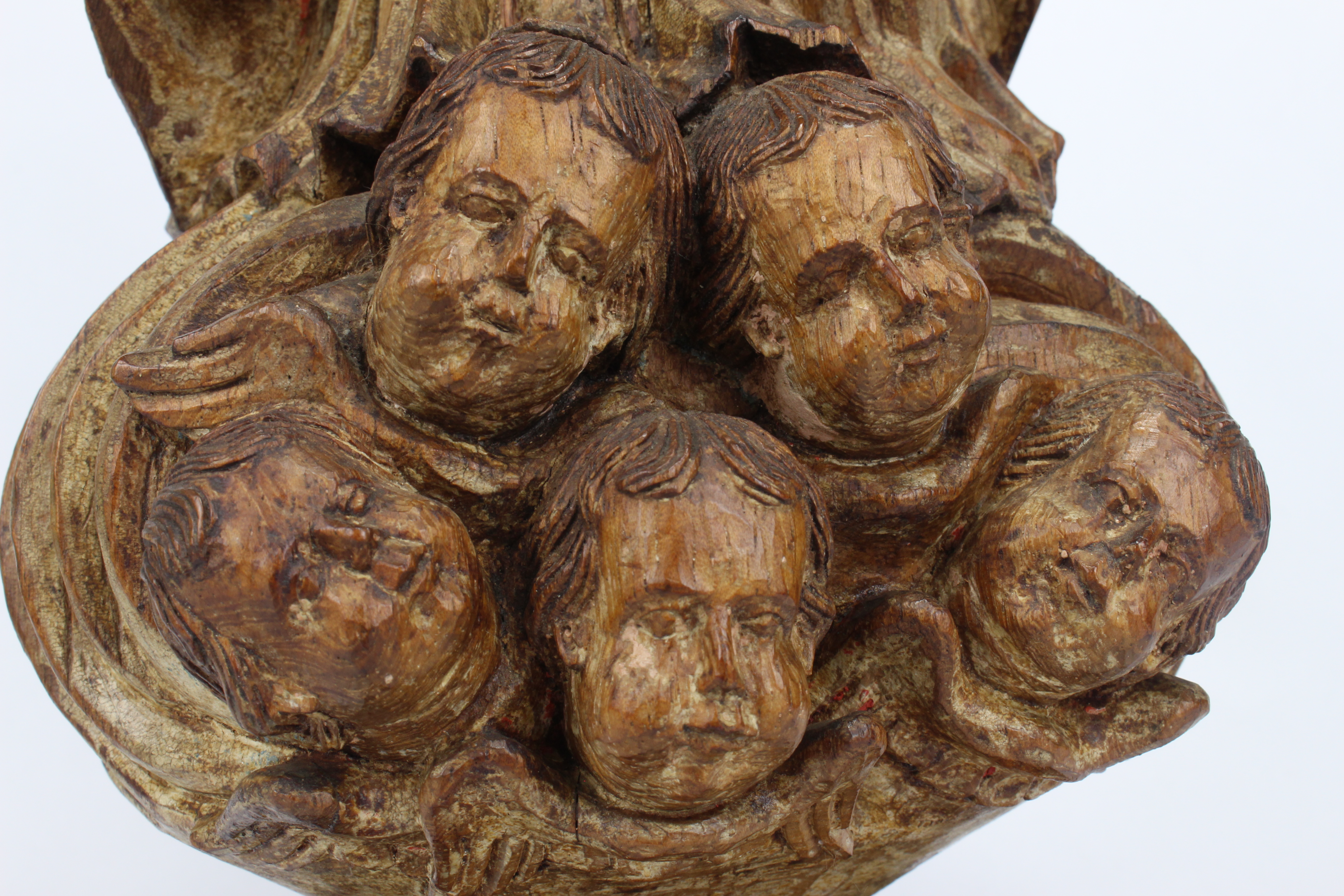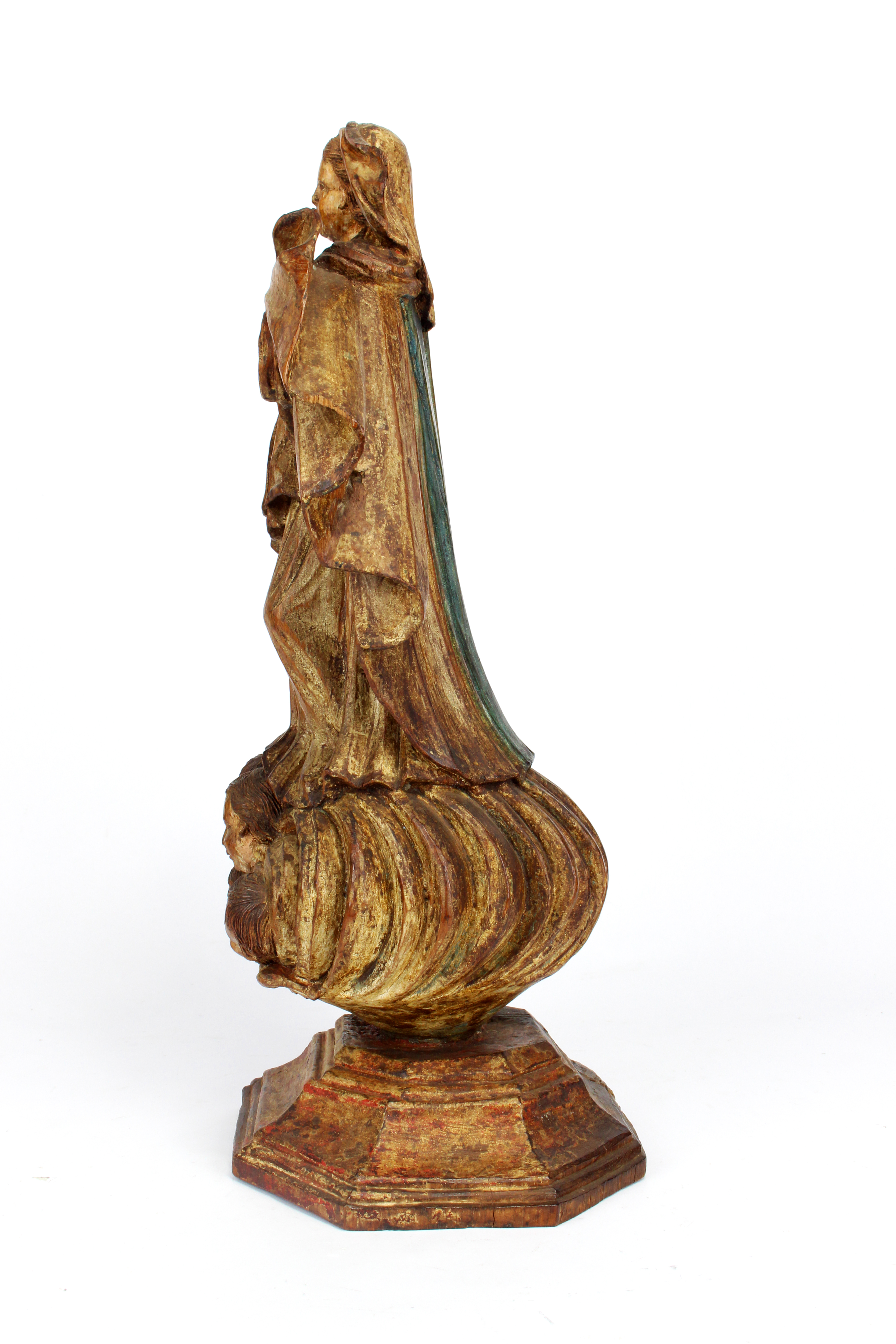 Peca com características da escultura religiosa mineira, datável do século XVIII, de fatura erudita, em composição elegante, de corpo esbelto, com os rostos cheios, em N. Senhora e nos anjinhos, de cabelos em estrias finas e onduladas; panejamento em dobras em movimento muito ondulado, indicando ser uma peça já da segunda metade do século.
