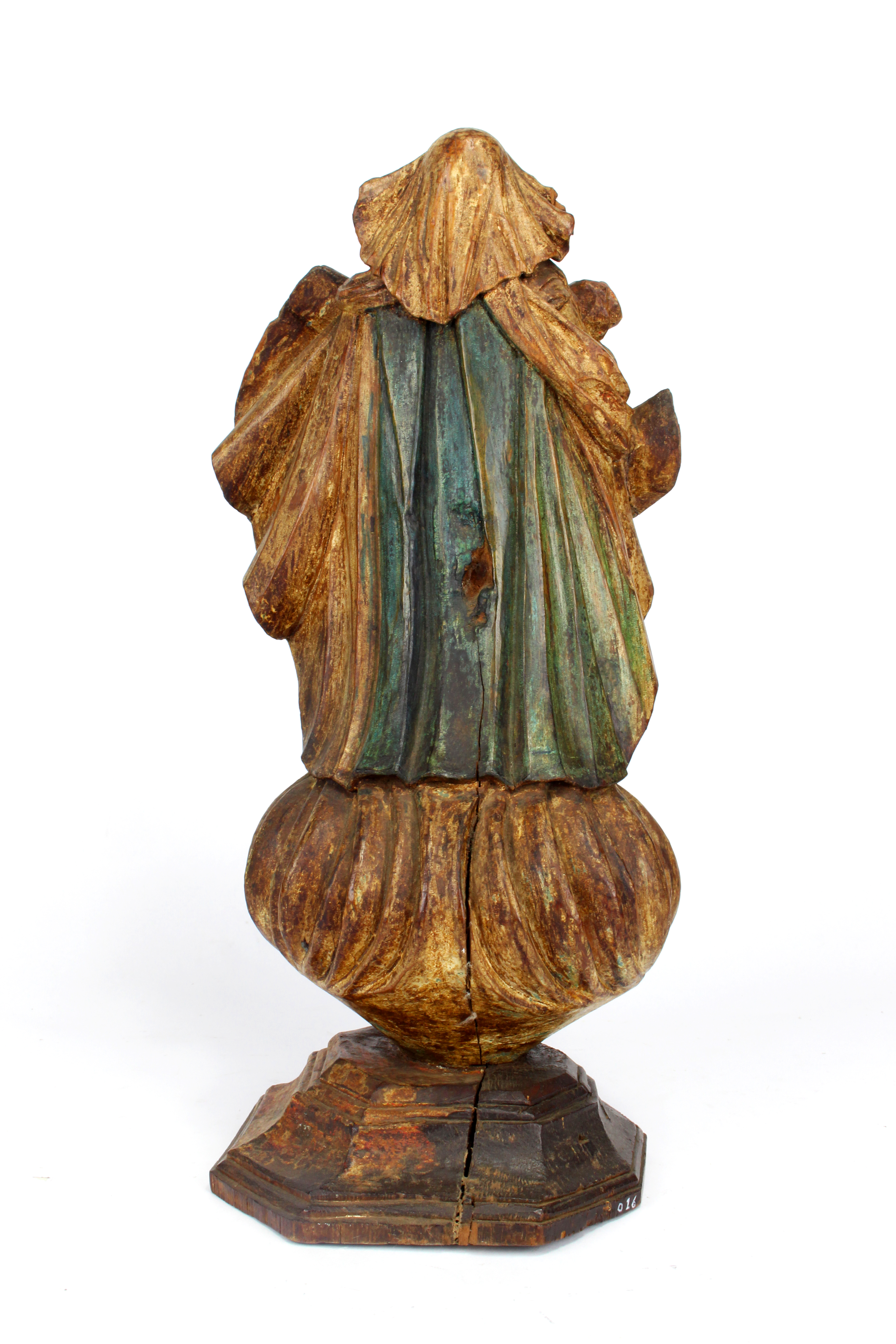Figura feminina, de meia-idade, em posição frontal, de pé sobre base atributiva, com a cabeça erguida, e o olhar direcionado à frente; cabelos compridos, em mechas sinuosas, com pontas caídas sobre os ombros, parcialmente cobertos por véu esvoaçante; tem os braços flexionados á frente, mas sem as mãos; perna esquerda dobrada e a direita reta, com os pés encobertos pela veste; vestida de túnica roçagante, cingida á cintura; com mantelete junto ao peito; manto jogado por trás, onde aparece em tem azulado, e enrolado nos dois braços, onde caí em dobras sinuosas,pelo lado esquerdo,e retas, pelo lado direito, com uma dobra ao centro. Base atributiva, em tufos de nuvens, tendo à frente cinco cabeças de anjos, sendo duas superiores, inclinadas para dentro, e três inferiores, com a do centro reta e as duas inclinadas para fora; os anjos tem os cabelos curtos, em estrias finas, partidos ao meio, com recortes laterais; as asas em recortes sinuosos, voltadas para baixo. Peanha oitavada, com as faces em seqüência de molduras meia-cana e frisos.