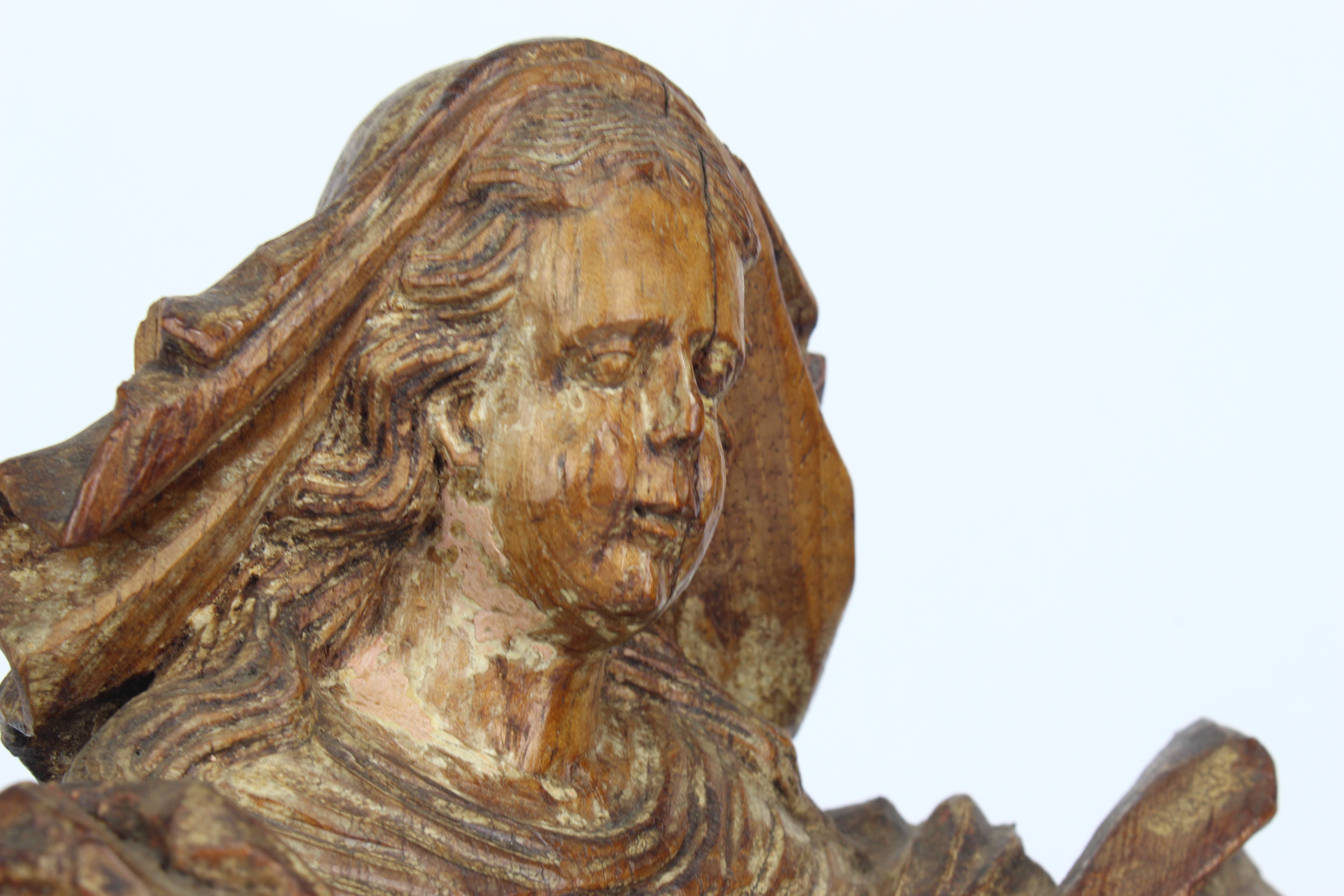 Peça esculpida em madeira (cedro), em quatro partes, com encaixe nas mãos e na peanha; resquícios de policromia em azul (parte posterior do manto) e vermelha (na peanha); cabeça com furo para receber adereço (coroa); peanha com remendo posterior feito em madeira escura, parafusado.