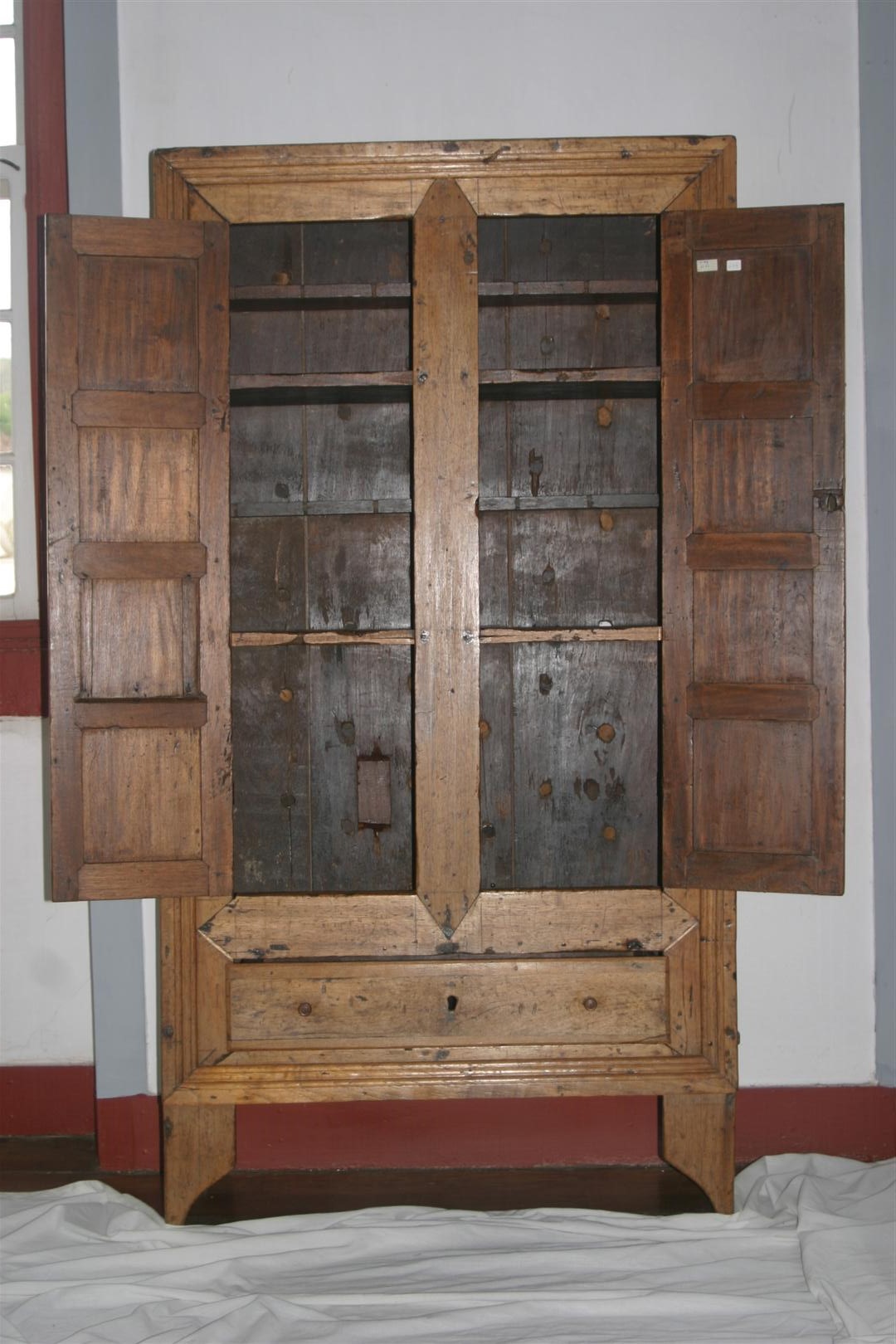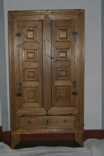 Guarda-louça confeccionado em madeira clara e escura, de dimensões médias e estrutura retangular, contendo quatro prateleiras e uma gaveta, apoiado sobre quatro pés. Objeto de linhas retilíneas, emoldurado na parte frontal por frisos, contendo duas portas estreitas, fixadas à estrutura do móvel através de duas dobradiças (não originais). Cada porta do móvel encontra-se ornada por quatro estruturas quadrangulares almofadadas. Na porta direita, orifício para encaixe da chave (sem o espelho de fechadura). Parte interna do móvel composta por quatro prateleiras, sendo duas mais estreitas, em madeira escura (jacarandá), que intercalam outras duas prateleiras maiores. Parte posterior do móvel composta por três tábuas de madeira escura, contendo diversos círculos preenchidos com tarugos (possivelmente que serviram para pendurar objetos ou produtos). Na parte frontal inferior, destaca-se uma gaveta retangular com dois puxadores torneados e com orificio central para encaixe da chave. Na parte inferior de cada lateral do móvel, duas pequenas estruturas retangulares, salientes, dispostas simetricamente. Objeto sustentado por quatro pés em madeira recortada com a parte central em colchete.