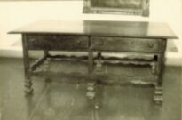 Sobre mesa: "Peça de mobiliário feita de madeira ou outro material sólido e resistente, e que consta de um tampo horizontal repousando sobre suportes e situado normalmente até 80 cm do chão (...) Mesa mineira. Mesa com tampo de madeira leve emoldurado de jacarandá e que se prolonga nas cabeceiras, para além da caixa, com gavetas profundas lisas, almofadadas ou com outras decorações (espinhas de peixe, doce-de-leite, goivados). Os pés são fortes e ora retos (em cavalete), unidos por travessas. Esse tipo de mesa apareceu em Minas Gerais, São Paulo, Goiás, no séc. XVII, e foi fabricado até o séc.XIX. Em Minas, essa mesa, quando rústica, era conhecida como “Dona Maria pobre”." (1)