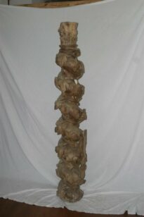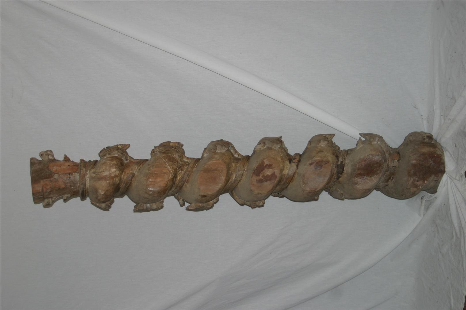Fragmento de retábulo, identificado como coluna salomônica ou torsa, confeccionado em madeira (jacarandá mineiro?) entalhada. Apresenta capitel composto por folhas de acanto sobre friso em meia-cana. Fuste envolto por friso representando caule e ornado por folhas de parreira (sem cachos de uvas). Parte do fuste recortado para encaixe na estrutura arquitetônica do retábulo.