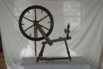 Objeto confeccionado em madeira, contendo roda e estrutura para prender os fios, apoiada sobre três pés.