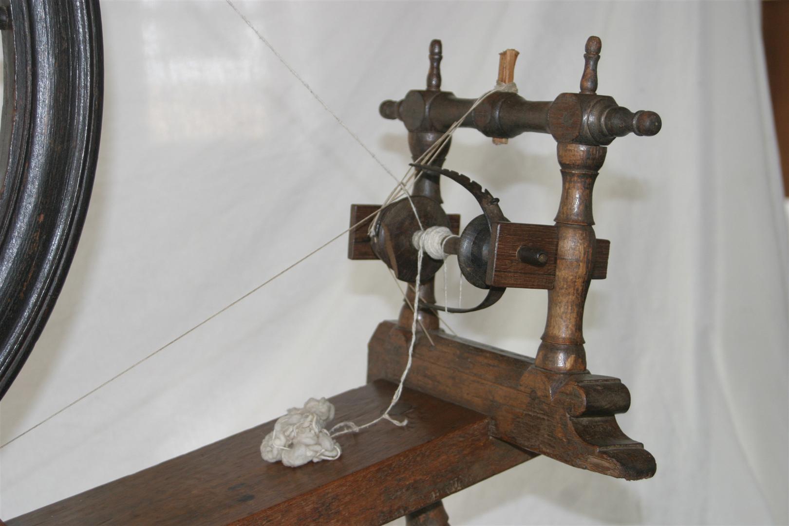 Roca de fiar confeccionada em madeira (jacarandá e cedro), sustentada por três pés torneados, posicionados em diagonal, tendo a parte central em tábua espessa, de formato retangular, arrematada na extremidade por estrutura composta por quatro pequenas hastes, estando as duas hastes verticais atravessadas por fuste com estrutura em metal (ferro), tendo uma das laterais denticulada para encaixe do fio de lã. Na outra extremidade, sobressaem da tábua central duas hastes longilíneas de madeira, dispostas em paralelo e ligeiramente em diagonal, com pinos de fixação da roda. Roda de formato grande confeccionada em madeira escura (jacarandá), vazada e ornada por frisos, seis hastes torneadas e seis bilros, tendo, ao centro, estrutura delgada em metal (ferro) que se prolonga em curva na extremidade. Estrutura em metal fixada a uma haste delgada de madeira, disposta verticalmente e presa ao pedal. Pedal disposto na parte inferior do objeto, composto por tábua de madeira, em formato triangular, fixada a dois pés da peça.