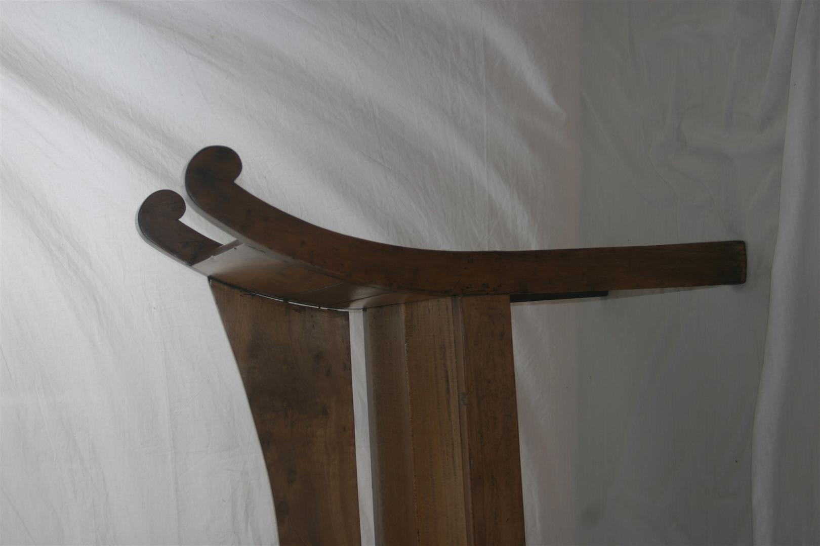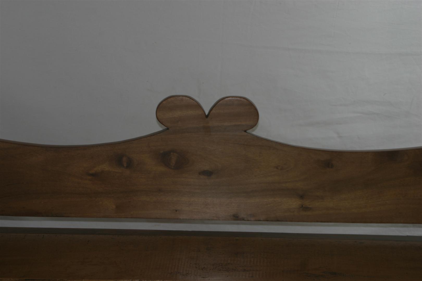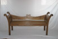 Sofá confeccionado em madeira clara, de manufatura rústica, com espaldar recortado, apoiado sobre quatro pernas. Móvel de dimensões médias, com assento composto por duas tábuas lisas, contendo saia reta e espaldar recortado em curvas, com ornato central em dois semicírculos dispostos lado a lado. Apresenta braços laterais salientes, arrematados por volutas, contendo estruturas formadas por quatro tábuas, dispostas uma em cada lateral. Pernas retilíneas, de secção quadrangular.